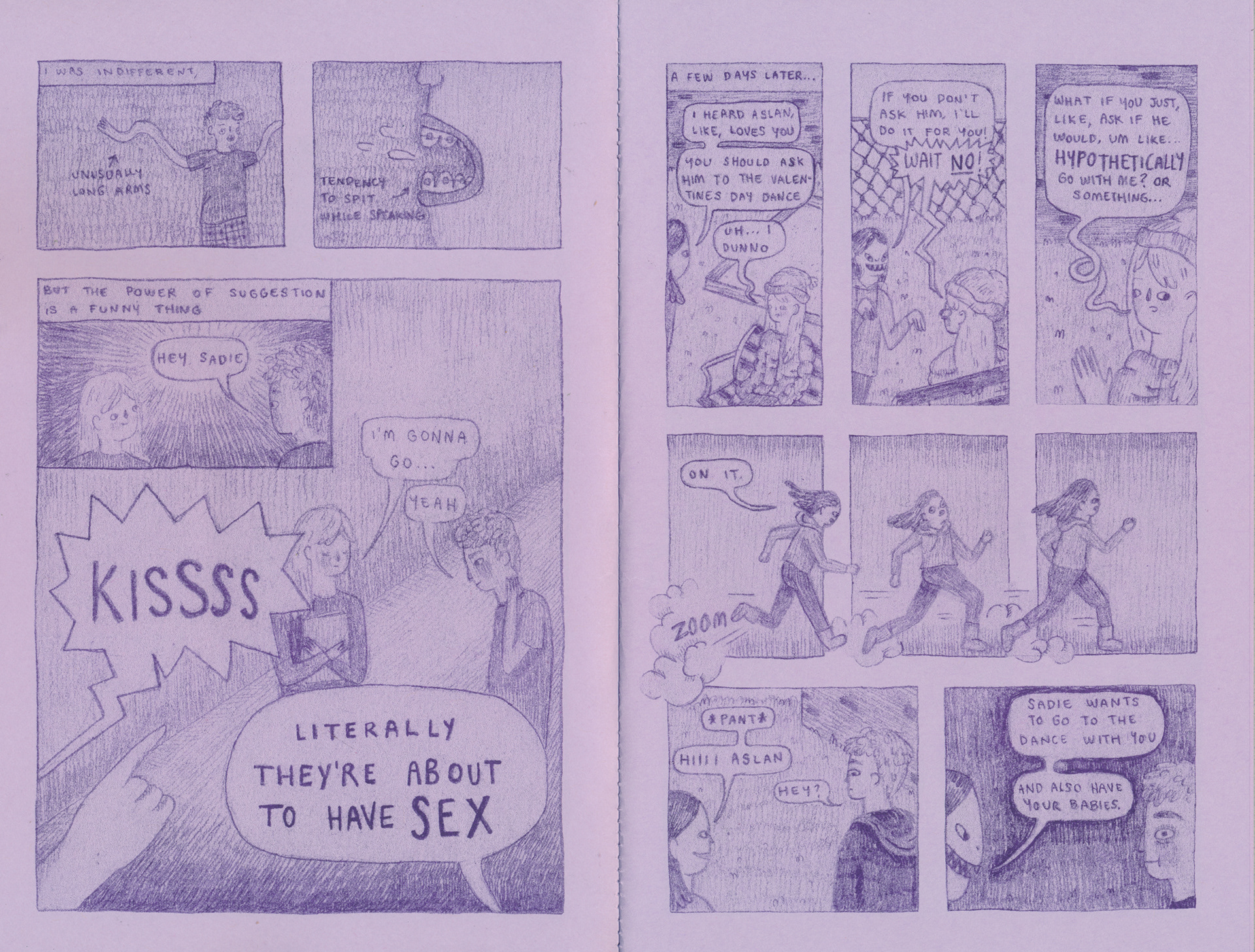 Good Grief is a 24-page Risograph comic exploring preteen angst and middle-school drama following a visit to a spiritualist gated community. It is the recipient of a MICE Mini-Grant and is distributed by Radiator Comics.