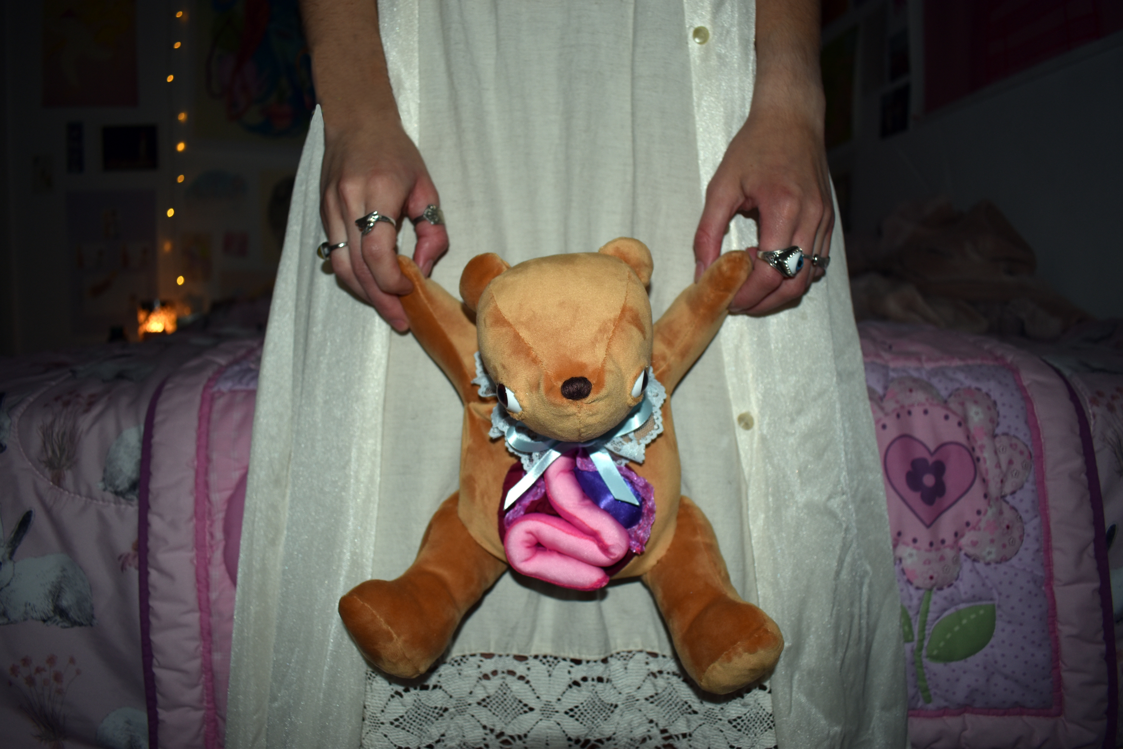 Harold's story goes like this: Harold was well-loved by a little boy named Jimmy, who received Harold on his fourth birthday. When most children grow up, they abandon their stuffed toys, but Jimmy was different. He took good care of Harold throughout his teens and understood that teddy bears need to be spoken to daily. When Jimmy got drafted into the army at 18, he left Harold behind, promising he wouldn’t be gone long. But Jimmy was shot in the stomach on the first day of battle, and Harold felt the bullet in his own gut, despite being miles away. In a magical moment of pure desperation, Harold grew the organs that were failing in Jimmy’s body, hoping Jimmy would be able to return and harvest them. Harold never saw Jimmy again, but still waits, forever hopeful, with organs ripe for the plucking.