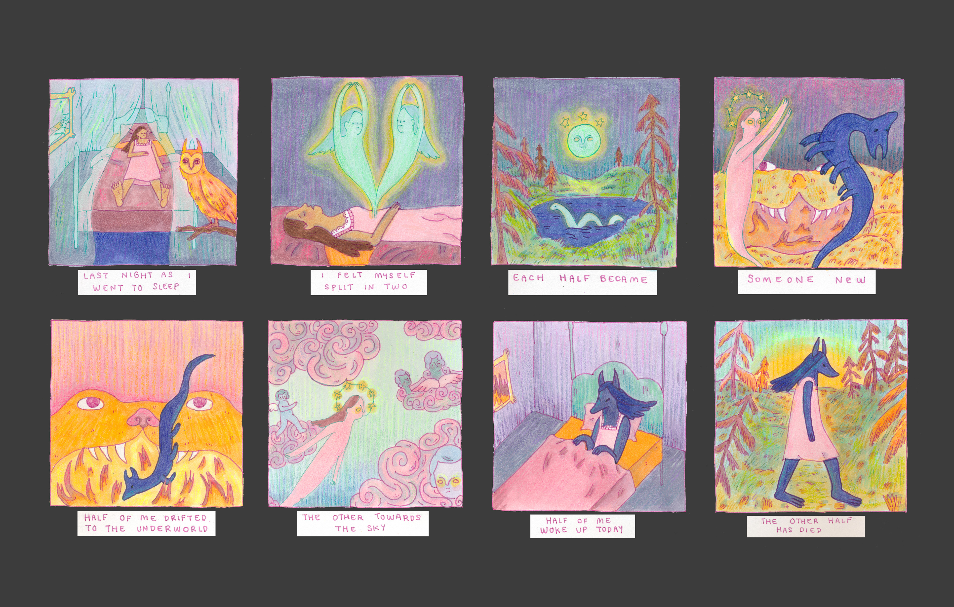 A hand-drawn comic exploring the dichotomizing experience of womanhood. Presented as a perfect-bound zine with a lenticular cover.